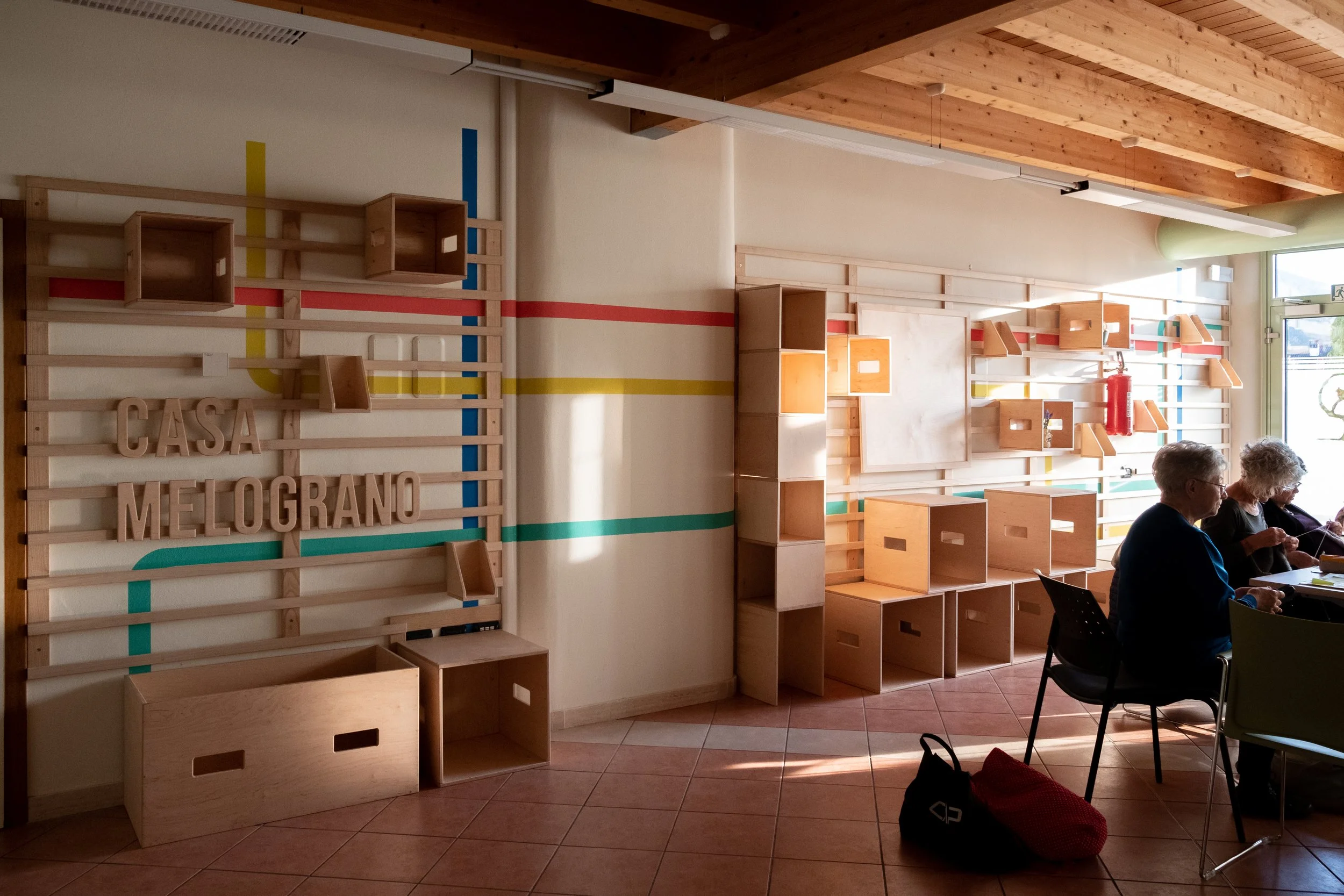 Si compone di una parete listellata e di moduli in legno che rispondono a diverse modalità di utilizzo (sedute, contenitori, espositori), ed è poi affiancato da un totem esterno che mira a rendere il luogo riconoscibile.